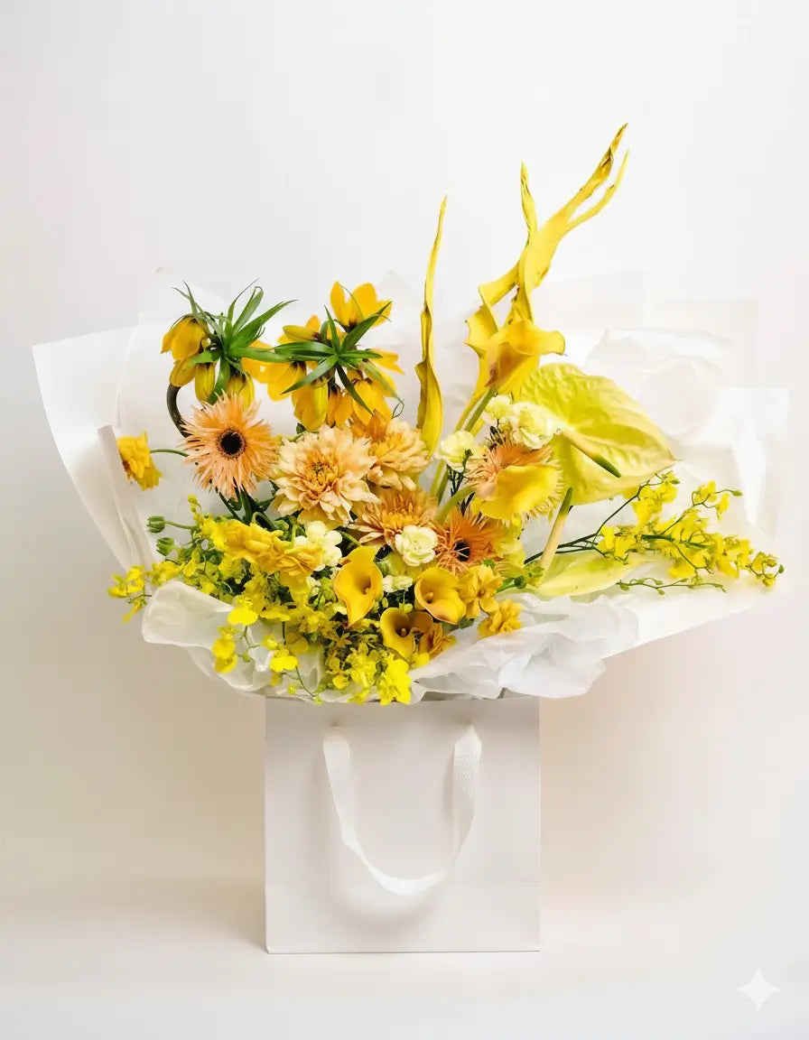 Sunburst Serenade is a vibrant bouquet featuring sunny yellow orchids, golden calla lilies, and soft garden florals. Perfectly wrapped in crisp white and accompanied by a chic Porsche sunset bag, it makes an elegant gift for any occasion in Dubai. Ideal for celebrating promotions, graduations, or simply brightening someone's day, this arrangement combines style and warmth to convey thoughtful sentiments with expert flair.